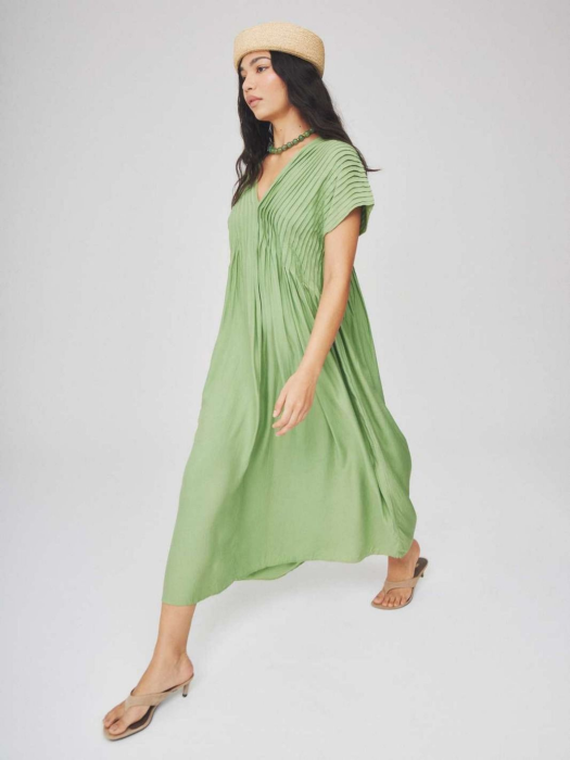 travail de plissés Verticaux sur le buste et les manches, créant un relief unique et sophistiqué. Cette robe longue propose un col en V noué, et une jupe évasée très légère.