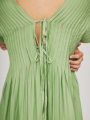 travail de plissés Verticaux sur le buste et les manches, créant un relief unique et sophistiqué. Cette robe longue propose un col en V noué, et une jupe évasée très légère.